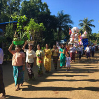 In the early morning of 26, this Padetha tree together with other trees from the village tract were carried around the village attended by music. All the participants wore nice dresses and marched alongside of the trees. It was the grand moment of this festival and some were even dancing with the music. People came out of their house to look at the dances and Padetha trees and some were making last minute donations by hanging additional offerings onto the trees. In the end, trees were delivered to the Aung Thuka Monastery where the Kahtein robe offering ceremony was held.
