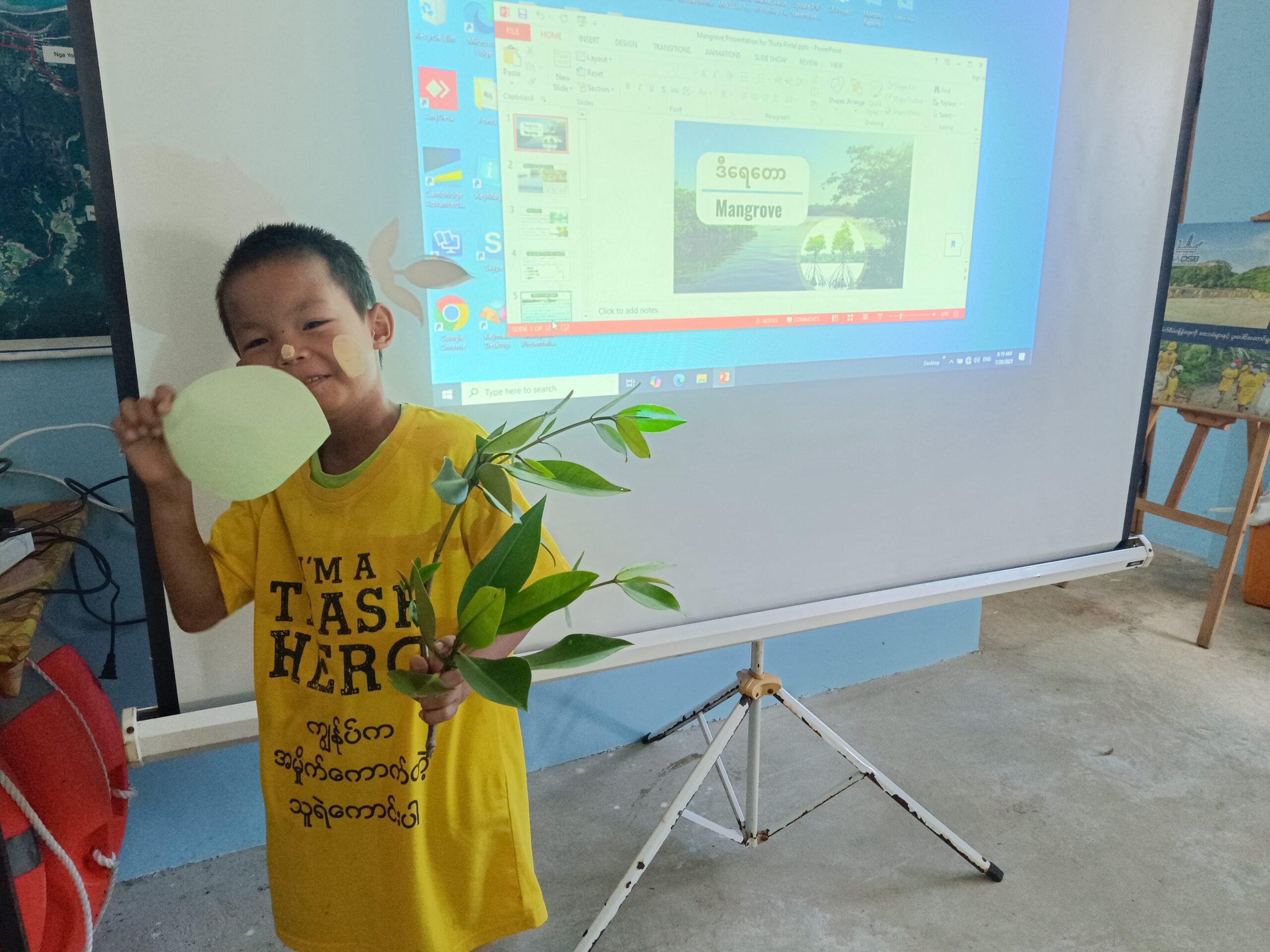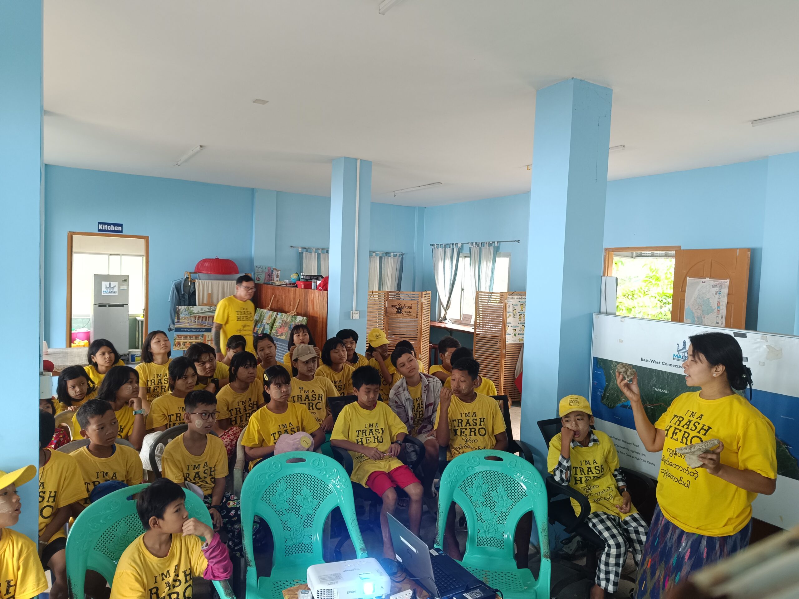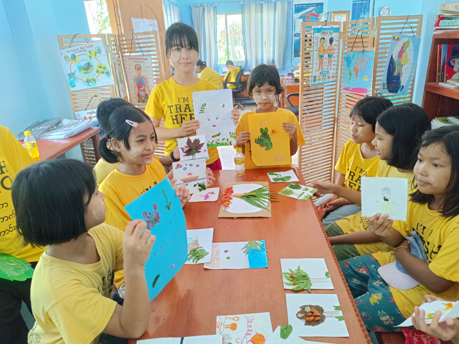 In June, the focus shifted from storybooks to the sea. The Coral Reef Conservation Knowledge Sharing Session transformed the library into an underwater classroom with coral samples, vivid visuals, and videos from the Coral Reef Conservation Pilot Project in Gaw Yan Gyi. Children discovered how coral reefs protect coastlines, support fish populations, and sustain livelihoods and why protecting them is vital for the community’s future.